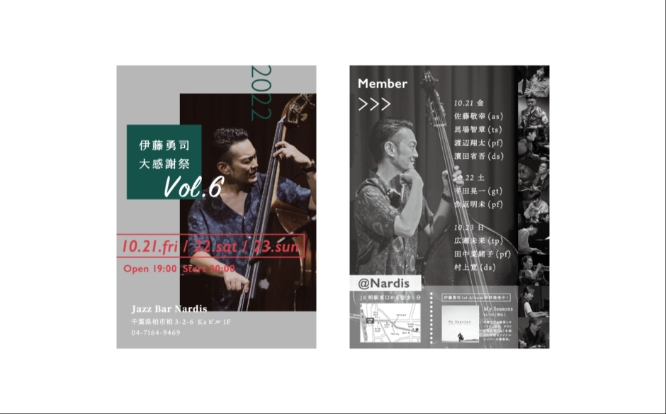 ジャズベーシスト伊藤勇司さんのライブフライヤーを制作させていただきました。