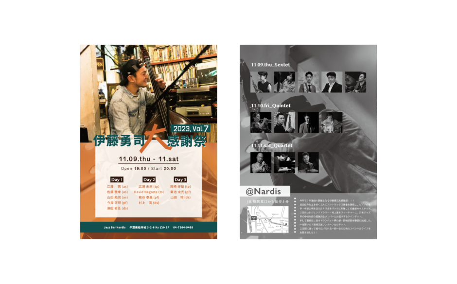 昨年に引き続き、ジャズベーシスト伊藤勇司さんのライブフライヤーを制作させていただきました。